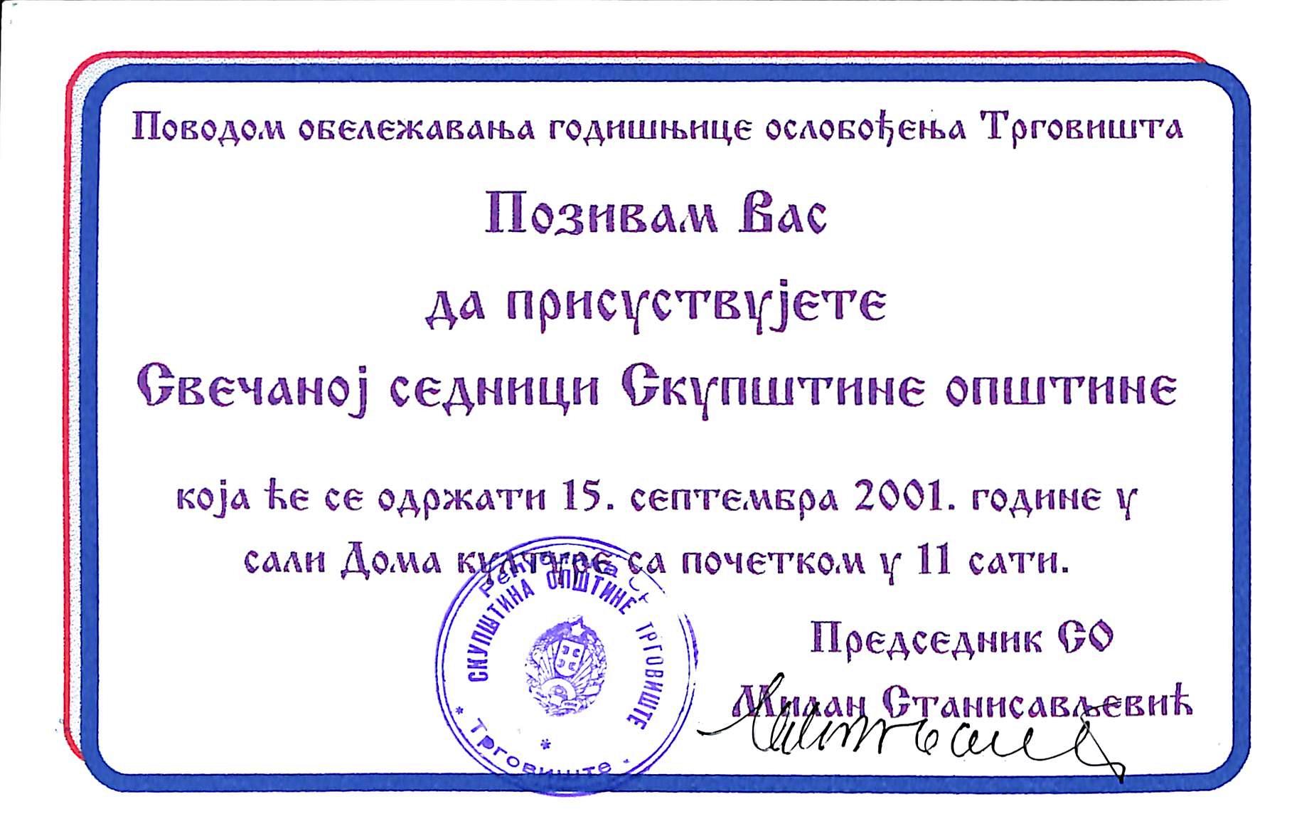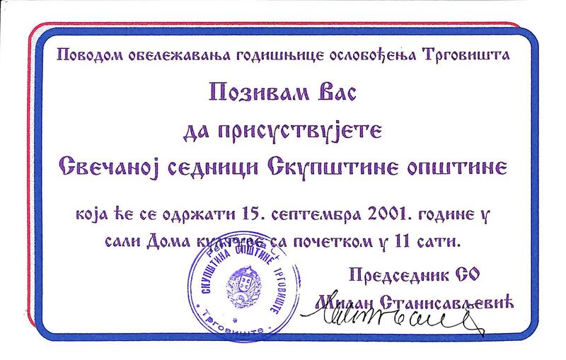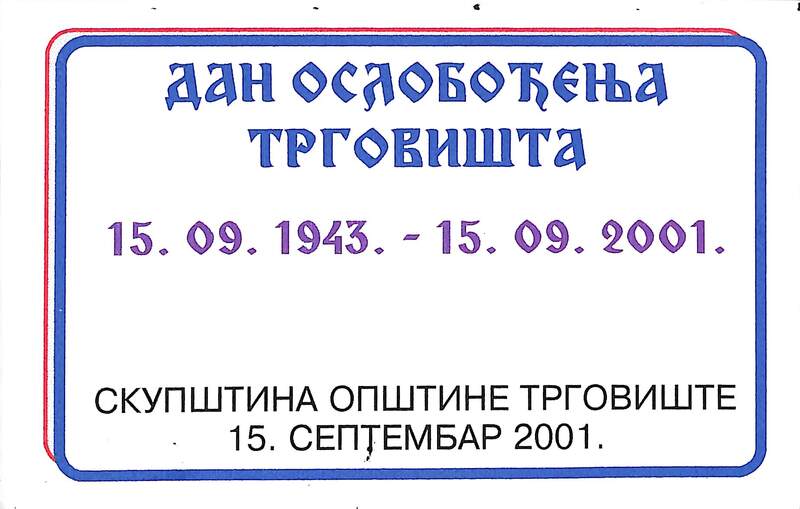 “Dan oslobođenja 2001 godine.,” Digitalna biblioteka "Antonije Popović" Trgovište, приступљено 27. april 2026., https://digitalna.bibliotekatrgoviste.rs/items/show/31.
