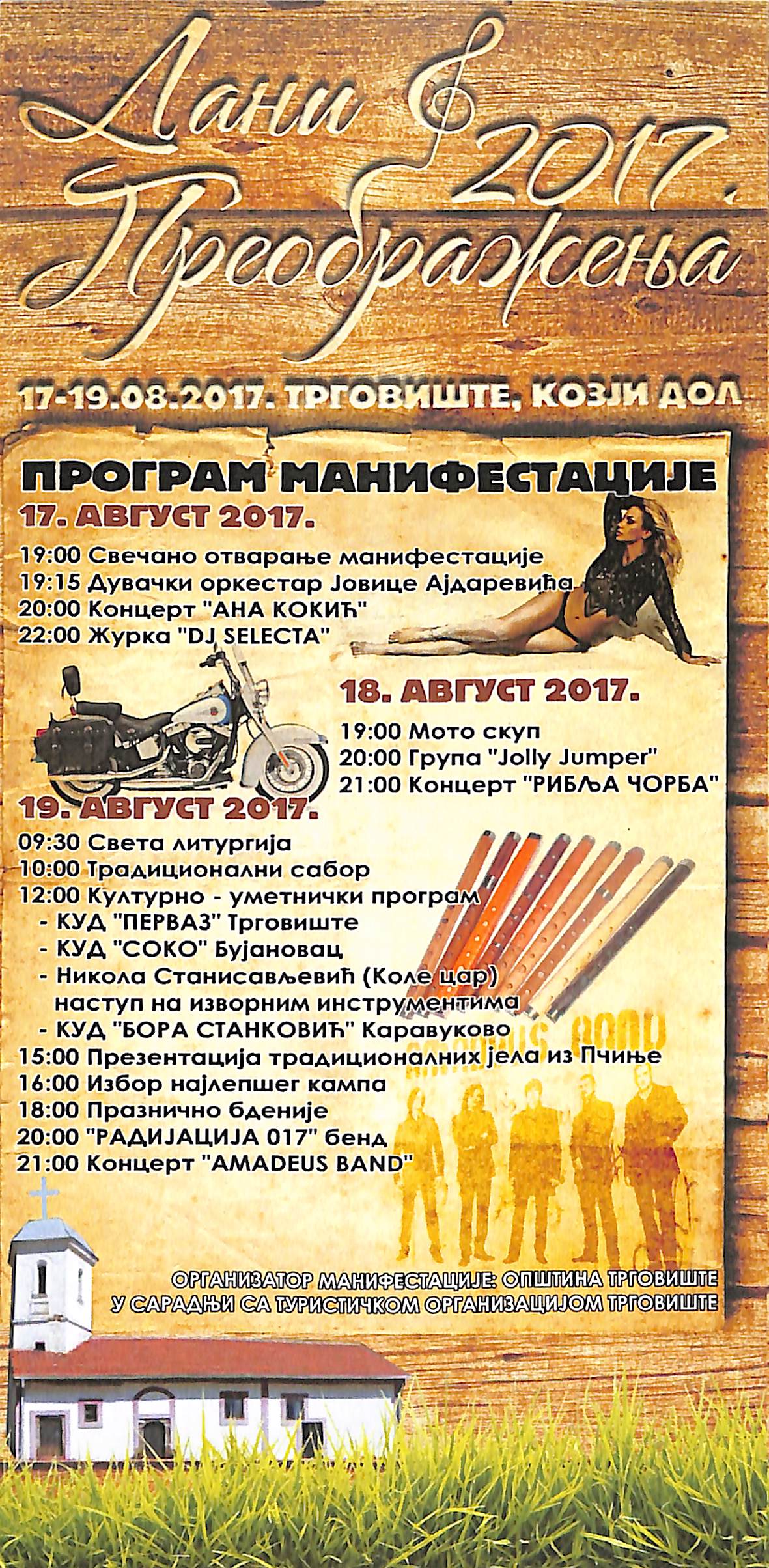 “Dani Preobraženja 2017. godine,” Digitalna biblioteka "Antonije Popović" Trgovište, приступљено 27. april 2026., https://digitalna.bibliotekatrgoviste.rs/items/show/33.